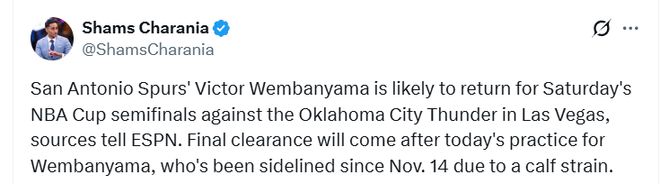 文班计划明日复出!与雷霆争夺NBA杯决赛门票此前因伤连缺12场